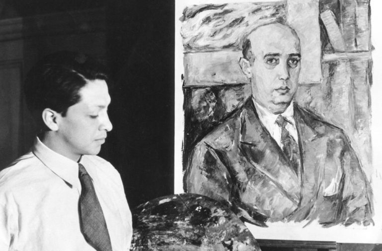 (Quito 1919-Baltimore 1999) Oswaldo Guayasamín Calero pintor y escultor ecuatoriano en 1941. El periodo durante su formación estética fue el periodo de esplendor de la Escuela Indigenista y el origen y manifestación de este artista manifestado en sus obras remarca su denuncia social y debido a las oposiciones su primera exposición de pinturas en 1942 causó un gran revuelo.